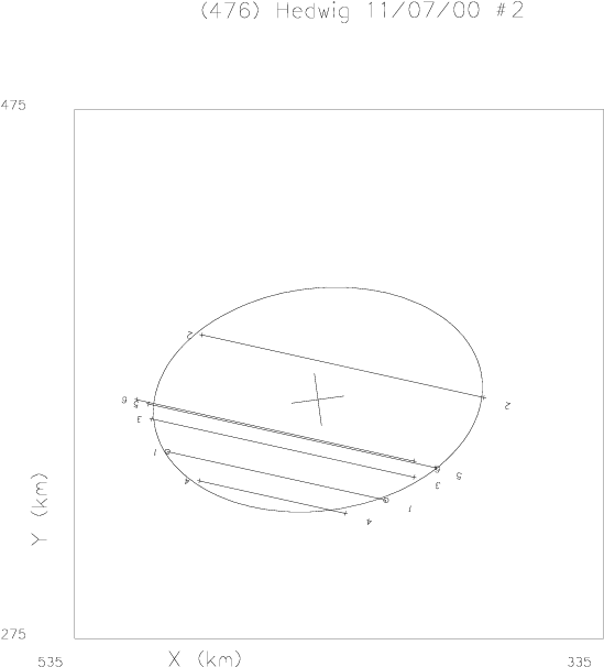 Auch am 7. November 2000 hat es dank eines sehr genauen Updates wieder geklappt. An diesem Abend beobachteten 6 Sternfreunde um Martin Dentel aus Berlin und Nordostbrandenburg, wie der 8.4 mag helle Stern HIP 103334 bis zu 6 Sekunden lang vom Kleinplaneten (476) Hedwig "ausgeknipst" wurde. Ergebnis: Die gemessenen Zeiten legen einen projizierten elliptischen Umriss des Kleinplaneten (Abb. 6) mit den Halbachsen 63 km und 42 km nahe. Der Radius war bislang aus IRAS-Daten zu 61 km angenommen worden.