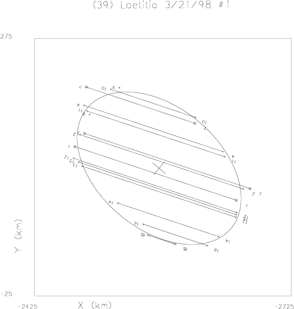 Abb. 5: Rekonstruktion von Größe und Umriss von (39) Laetitia aus der Bedeckung von PPM 121913 am 21. März 1998. Die Daten passen am besten zu einem mittleren projizierten Ellipsoid mit den Halbachsen 72 km und 113 km. Kleinere Irregularitäten der Oberfläche deuten sich an (IOTA/David W. Dunham).