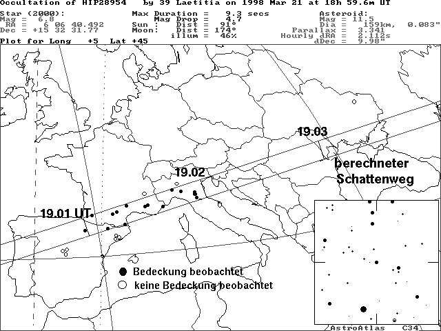 21. März 1998, kurz nach Sonnenuntergang. Hektisch suchen einige Amateur- und Fachastronomen in Spanien, Südfrankreich, Norditalien und der Ukraine den 6.8 mag hellen Stern HIP 28954=PPM 121913 im nördlichen Teil des Sternbilds Orion. Es bleibt nicht viel Zeit, denn gegen 19 Uhr UT soll dieser Stern für ein paar Sekunden vom Kleinplaneten (39) Laetitia bedeckt werden. Die Beobachtung gelang tatsächlich: Von 15 Standorten aus wurde eine Sternenfinsternis registriert, 9 sahen keine Bedeckung. Die Zone der Bedeckung war offenbar genauso verlaufen wie Jan Manek und Martin Federspiel es einige Tage zuvor berechnet hatten (Abb. 4).
