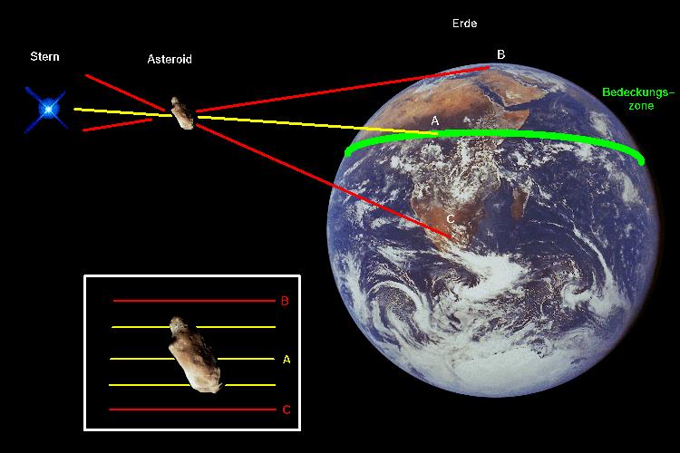 Überlegen wir noch etwas genauer. Verschiedene Beobachter an verschiedenen Standorten auf der Erdoberfläche sehen den meist ja nur wenige AE entfernten Kleinplaneten jeweils um einen winzigen Winkelbetrag gegenüber dem viel weiter entfernten Sternenhintergrund verschoben (Parallaxe). Die Situation ähnelt der bei einer totalen Sonnenfinsternis: Je nach dem, wo man auf der Erde steht, sieht man, dass der Mond die Sonne völlig abdeckt oder man schaut ein wenig am Mond vorbei und beobachtet, wie der Mond die Sonne nur teilweise oder gar nicht abdeckt. Wie bei einer Sonnenfinsternis gibt es auch bei einer Sternenfinsternis durch einen Kleinplaneten eine Zone auf der Erde, innerhalb derer man eine Bedeckung sieht. Diese Bedeckungszone ist - je nach Projektion auf die Erdoberfläche - mindestens so breit wie der Kleinplanet groß ist. Und wie bei einer Sonnenfinsternis fällt die Bedeckung kürzer aus, wenn der Beobachtungsort in der Nähe des Randes der Bedeckungszone liegt.