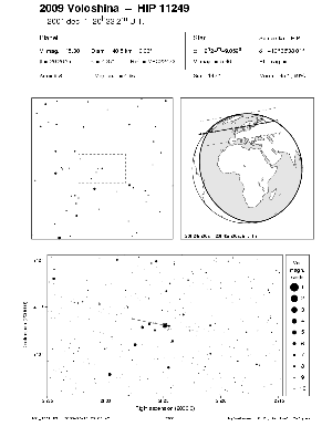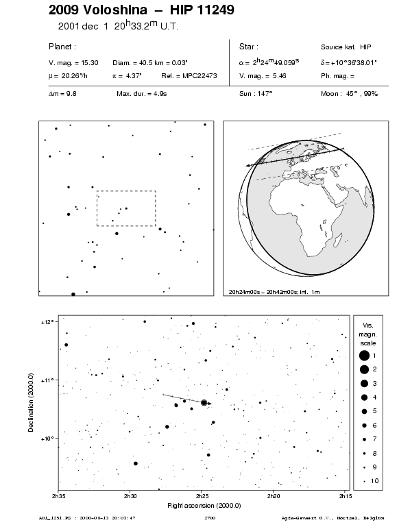 Sind Sie neugierig geworden? Möchten Sie vielleicht auch eine Sternbedeckung durch einen Kleinplaneten beobachten oder zur genaueren Vorhersage der Bedeckungszone beitragen? Die nächste Bedeckung eines helleren Sterns, die möglicherweise von Teilen Deutschlands aus sichtbar ist, ereignet sich am 1. Dezember 2001 gegen 21.30 Uhr MEZ. Dann soll der nur etwa 40 km große und 15.3 mag schwache Asteroid (2009) Voloshina vor dem 5.5 mag hellen Stern xi Arietis (HIP 11249) vorüberziehen. Nach Berechnungen von Edwin Goffin auf der Basis einer älteren Bahn des Asteroiden läuft die Bedeckungszone über Skandinavien und Schottland. Die Bahn des Kleinplaneten ist aber dringend verbesserungsbedürftig. Die Bedeckungszone könnte vielleicht über Deutschland liegen - das wollen wir nicht verpassen. Mit Ihren Positionsmessungen in den kommenden Wochen und Monaten können Sie mithelfen, dass wenige Tage vor dem Ereignis ein entsprechendes last-minute Update gerechnet werden kann. Wenn Sie in der Nähe der Bedeckungszone wohnen, lohnt sich eine Beobachtung auf jeden Fall. Die Fachgruppe Sternbedeckungen bzw. IOTA/ES freut sich schon auf Ihre Daten (bitte an [17], auch dann, wenn von Ihrem Standort aus der Stern nicht bedeckt wurde.
